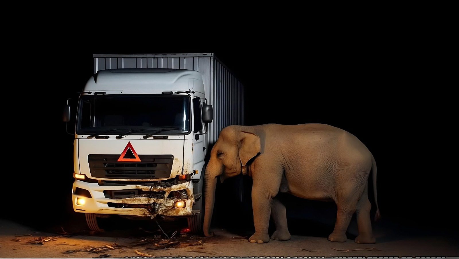 Namun, secara tiba-tiba, anak gajah tersebut berlari menyeberang jalan. Jarak yang terlalu dekat membuat sopir tidak sempat mengerem, sehingga tabrakan pun tak terhindarkan. Anak gajah itu langsung tewas di tempat, terjepit di bawah truk. Terlihat pula kerusakan pada truk yang menandakan tabrakan yang terjadi cukup kuat.